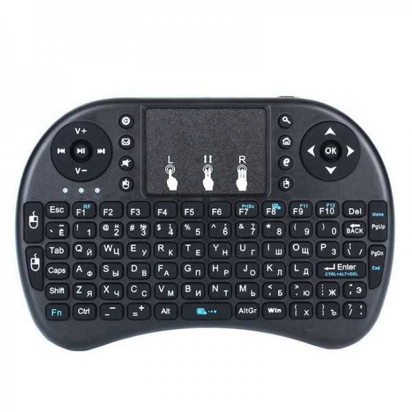 Высокотехнологичная мини клавиатура, оснащенная тачпадом, без труда подключается к любому современному устройству, работающему на Windows или Android. Это может быть ноутбук, планшет, телефон, игровая консоль, tv box или смарт тв телевизор. Присоединение происходит по беспроводному каналу с частотой 2,4 ГГц за счет специального адаптера, который входит в комплект поставки. Владелец клавиатуры I8 после завершения синхронизации последнего получает доступ к следующим функциям: